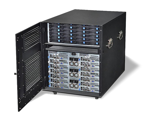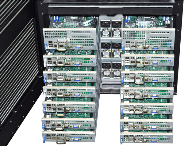 富易堂融合一体机就是解决环境使用问题而推出的综合性计算产品,它不需要专业的机房设施,不需要专业的配电和空调设备,放在办公室或实验室接墙电就可使用, 具有低噪音、低功耗等特点。最高可以安装14个双路XEON E5 处理器的刀片服务器,48个外置热插拔硬盘存储,内置一个万兆网络交换机安装空间,带有整体状态显示和控制系统,内部散热和防尘处理。专为办公室应用环境 设计,它在众多方面超越了传统机架式服务器、刀片服务器和机群服务器,是高稳定、高性能、低环境要求的新一代桌边型高性能计算机。它采用整体优化的设计, 有效降低了系统功耗,再加上其人性化的设计、很强的系统扩展能力、卓越的性价比和计算密度,可以覆盖更广泛的个人及工作组用户对高性能计算的需求,与传统 的高性能计算机相比,富易堂融合一体机可给予更有竞争力的整体解决方案,是更好满足中小高性能计算需求的理想平台。下图为14个刀片打开效果图:
